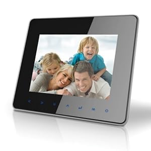 Front touch controls dim when not in use. Displays JPEG photo files, plays MPEG-4 and motion JPEG video files.